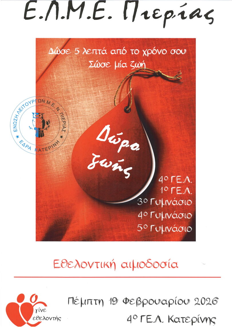 Η αιμοδοσία θα πραγματοποιηθεί από τις 9:00π.μ έως 13:00μ.μ σε αίθουσα του 4ου ΓΕΛ και σε αυτή τη δράση θα διδάξουν με τον πιο βιωματικό τρόπο,οι εκπαιδευτικοί της Πιερίας και οι μαθητές της Γ΄ Λυκείου, την ανιδιοτελή προσφορά στους συνανθρώπους τους.