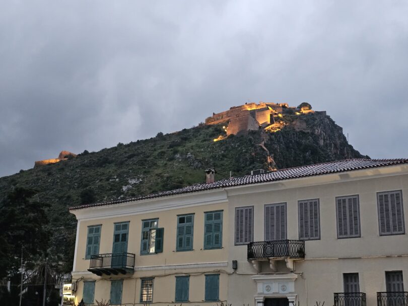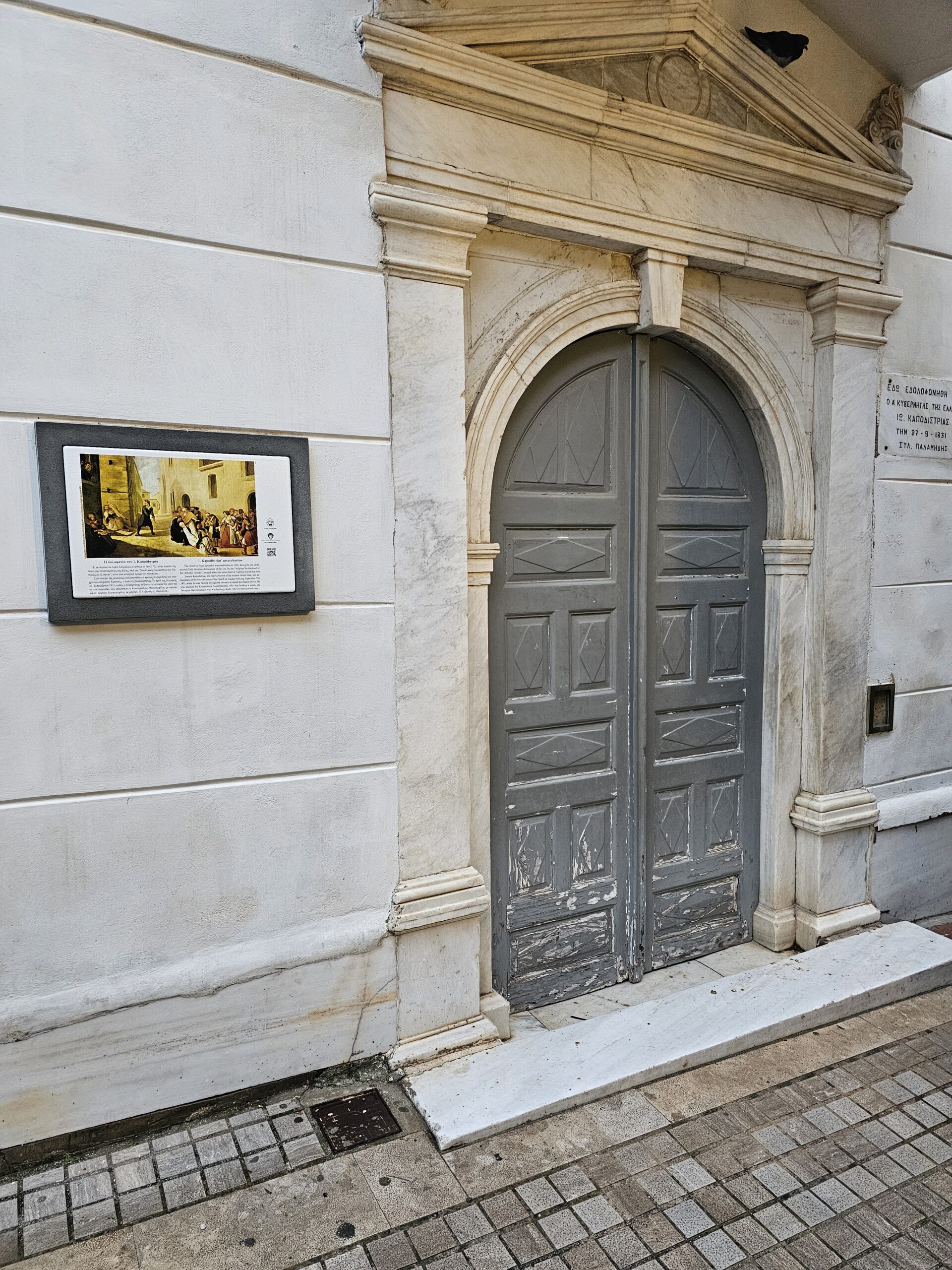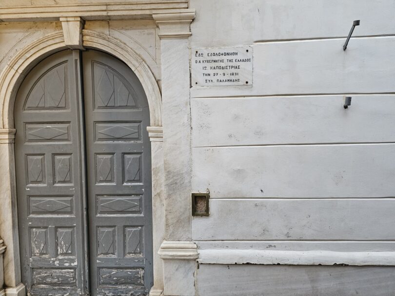 Κατά την άφιξή μας στο Ναύπλιο, περιηγηθήκαμε στην πόλη, περπατώντας στα στενά της, όπου θαυμάσαμε τα υπέροχα κτίρια κομψής, νεοκλασικής αρχιτεκτονικής και σταθήκαμε στον ιστορικό ναό του Αγίου Σπυρίδωνα, έξω από την είσοδό του οποίου δολοφονήθηκε την 27/9/1831 ο πρώτος κυβερνήτης της Ελλάδας, Ιωάννης Καποδίστριας.